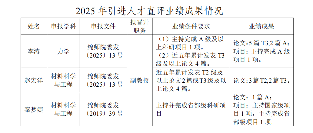 根据学校文件规定,经个人申报、审查推荐、代表性成果鉴定、业绩审定等程序,拟推荐李涛等3名教师参加学校2025年专业技术职务直接评审,具体名单及业绩成果公示如下:
